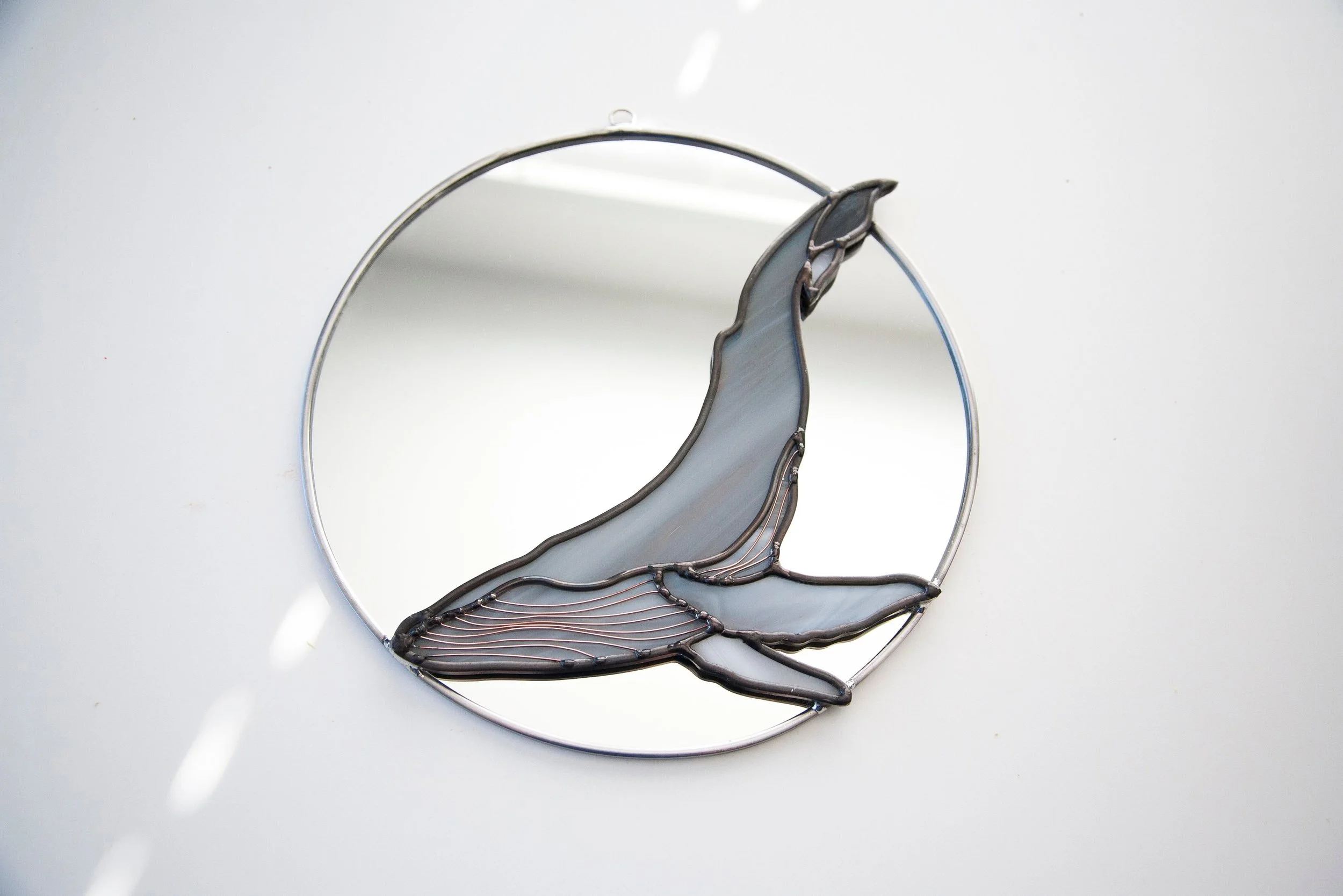 Humpback mirror is cut, sealed and assembled all by hand. Using stained glass techniques, with lead came and solder, to create this minimally designed stained glass humpback whale on top of a circle moon.